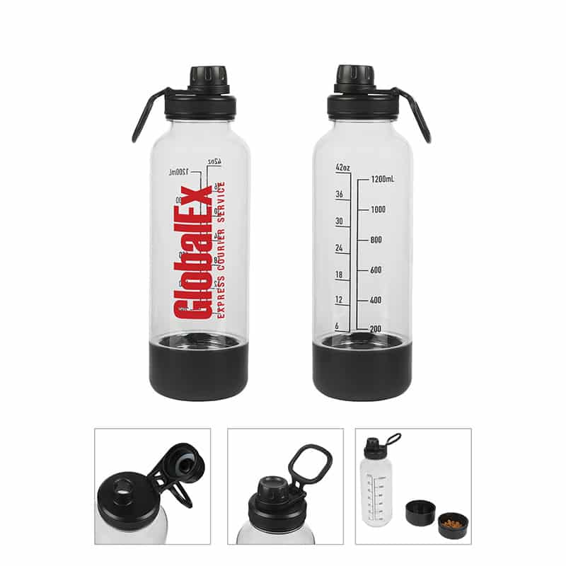 Experience the convenience and versatility of the Duke 50 oz. Plastic Water Bottle and discover a new level of hydration for you and your beloved pet. The translucent body of the bottle offers a clear view of the contents inside, and the capacity markings allow you to easily monitor the water level and ensure you stay hydrated throughout the day. It comes with a leak-proof screw top lid with chug spout for easy drinking and a silicone band provides extra grip and the hinged handle adds comfort a. Complies with Prop 65. 4″ W x 12 3/4″ H x 3 7/8″ D